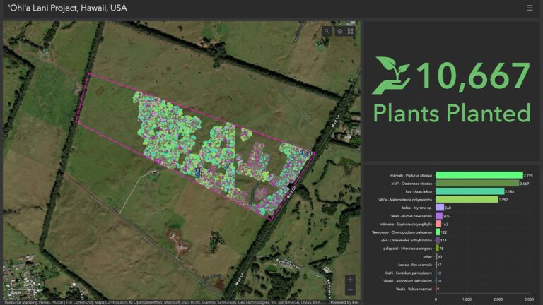 El Proyecto ‘Ōhi’a Lani es quizás uno de los ejemplos más impresionantes de los tableros de control de Terraformation. Este sitio de reforestación fue una vez colinas áridas cubiertas de pastos invasivos. Ahora, un tablero creado con ArcGIS Dashboards muestra su transformación en un bosque húmedo nativo.