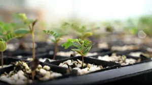 Una plántula de koa crece en uno de los viveros de Terraformation. Esta especie de árbol es endémica de las islas hawaianas y es la especie de árbol nativo más grande de las islas.