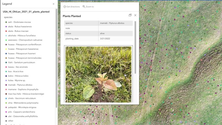 Esta información se envía en tiempo real a ArcGIS Online . De vuelta en la oficina, los miembros del equipo pueden ver el progreso, ordenar la distribución de especies por color y obtener información sobre cada planta haciendo clic en los puntos individuales.