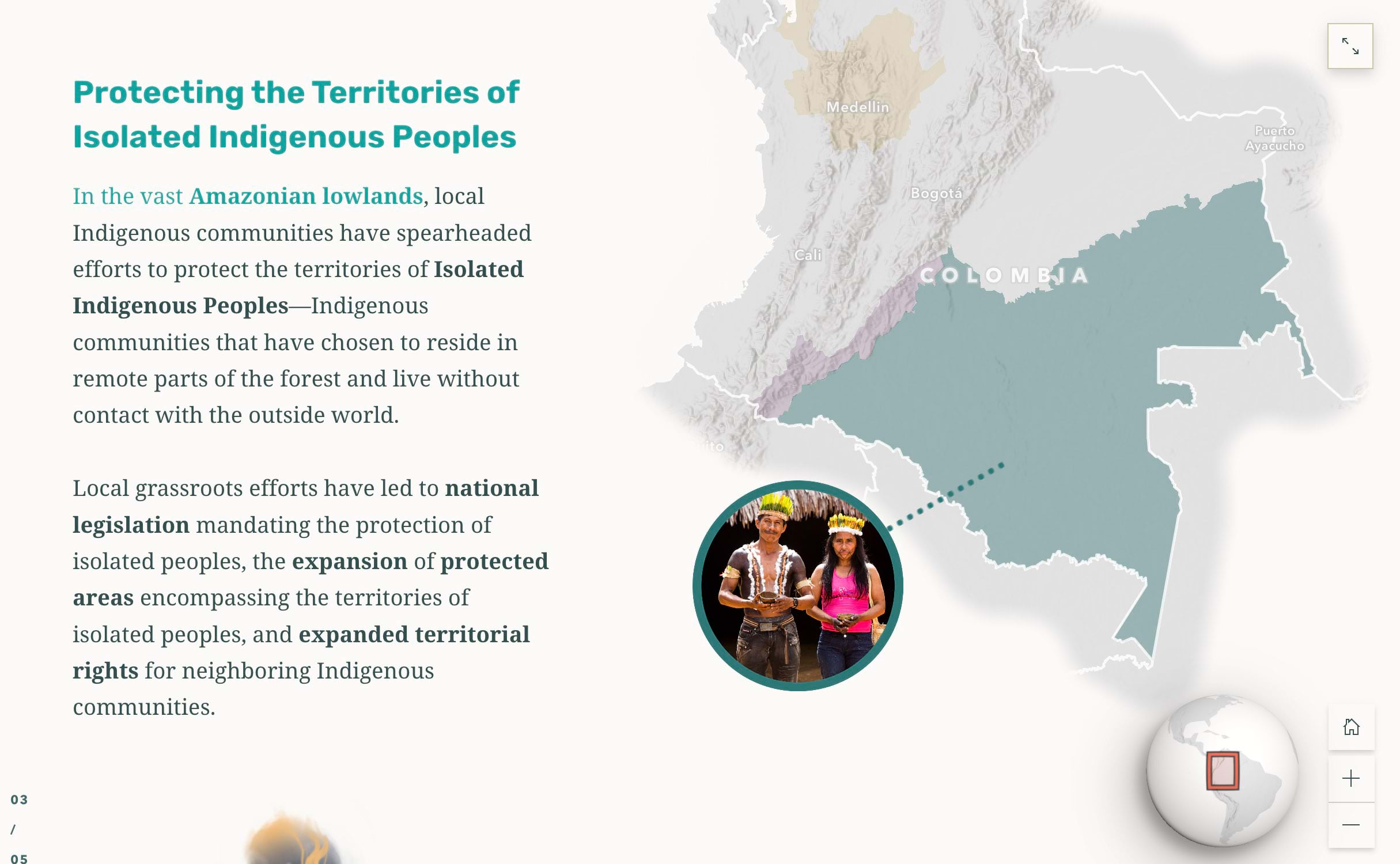 El segundo punto de los “Nueve pasos” es una manera segura de atraer a los lectores, la mayoría de los cuales tienen más probabilidades de relacionarse con personas que con conceptos abstractos. El Equipo de Conservación del Amazonas tejió imágenes y citas de pueblos indígenas en su narrativa de  Territorios Vivos.
