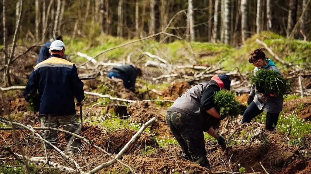 Un equipo planta plántulas en una parcela recién cosechada. (Foto cortesía de RoyOMartin)