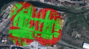 La figura muestra un ráster de análisis de cuenca visual mostrado sobre imágenes de GeoEye en ENVI.