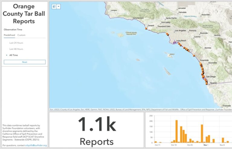 Una semana después del derrame de petróleo, más de 10.000 personas se inscribieron para ayudar. Surfrider los animó a recopilar datos sobre bolas de alquitrán utilizando las aplicaciones geoespaciales que creó con la ayuda de Esri y un voluntario de GISCorps, un programa de servicios GIS proporcionado por la Asociación de Sistemas de Información Urbanos y Regionales (URISA).