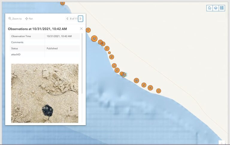 Lo primero que se les instruyó a los voluntarios fue a ir al hub de limpieza de derrames de petróleo de Surfrider, un sitio creado con ArcGIS Hub que orienta a los voluntarios, realiza un seguimiento del progreso y brinda información al público. Desde la pestaña Voluntarios, las personas podían descargar una aplicación ArcGIS QuickCapture usando un código QR o un enlace, o hacer observaciones a través de un formulario web en ArcGIS Survey123. Una de las ventajas de usar QuickCapture fue que los participantes podían rastrear dónde habían estado, lo que les mostraba a otros voluntarios qué playas habían observado recientemente. Sin embargo, con cualquiera de las aplicaciones, estos científicos ciudadanos recién descubiertos podían fotografiar rápida y fácilmente bolas de alquitrán en la playa, y las aplicaciones registraron automáticamente las coordenadas GPS donde se tomó la foto, así como la fecha y la hora.