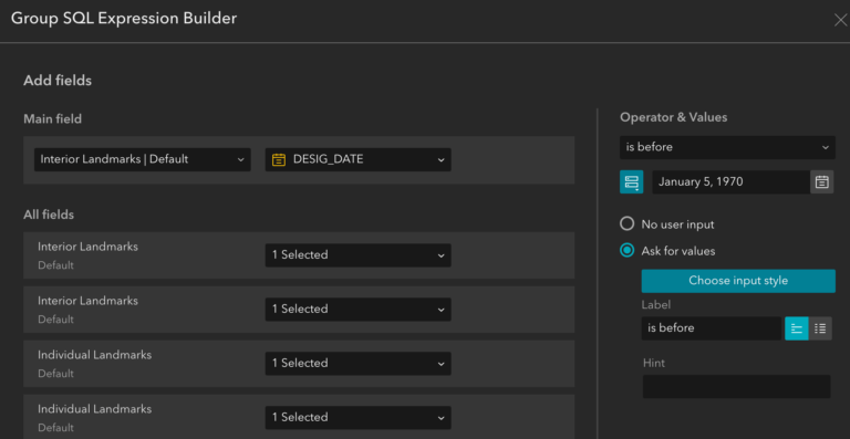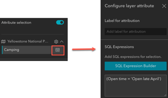 Para configurar selecciones de atributos en el mapa, haga clic en la capa seleccionable para definir la expresión SQL como se muestra a continuación.
