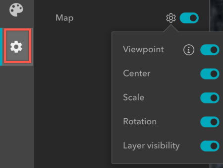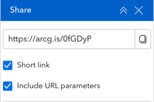 Cuando los activa y obtiene una vista previa o publica la aplicación, la URL de la aplicación contendrá información sobre el punto de vista, el centro, la escala, la rotación y la visibilidad de capas del mapa actual. También puede utilizar el widget Compartir para obtener un enlace corto que incluya cualquier parámetro de URL que active.
