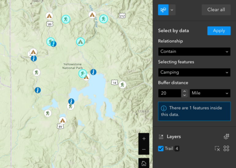 También puede seleccionar entidades por sus relaciones espaciales con otros datos. En el siguiente ejemplo, seleccioné todos los senderos dentro de una zona de influencia de 20 millas de un determinado campamento. Cuatro senderos se ajustan a ese criterio de selección. El ícono de información debajo de Distancia de zona de influencia muestra cuántos campamentos en la capa Camping, que es una capa de selección, participan en la selección mientras la capa Sendero es una capa seleccionable.