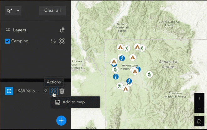 Puede seleccionar funciones agregadas en tiempo de ejecución. Por ejemplo, cuando la capa de perímetros del incendio forestal de Yellowstone de 1988 se agrega al mapa a través del widget Agregar datos, se puede seleccionar en el widget Seleccionar.