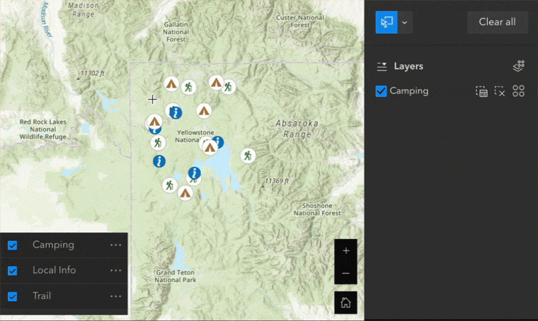 El siguiente ejemplo tiene tres capas en el mapa y solo se puede seleccionar la capa Camping. Los sitios para acampar se seleccionan dibujando en el mapa y luego se seleccionan según su horario de apertura. Los resultados de la selección se pueden exportar o ver en un widget de tabla.