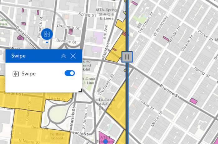 El nuevo widget Seleccionar le permite ajustar la selección de funciones en base a atributos, dibujos interactivos en el mapa y relaciones espaciales con otros datos. La nueva opción Grupo en el widget Filtro le permite filtrar varias capas. Los widgets Mapa y Búsqueda tienen nuevos parámetros de URL. Otras mejoras muy esperadas incluyen la capacidad de buscar y reordenar capas en el widget Capas de mapa, obtener estadísticas sobre campos numéricos utilizando la nueva acción de datos Estadísticas, y compatibilidad con análisis ráster en el widget Análisis. Veamos en detalle estas características.
