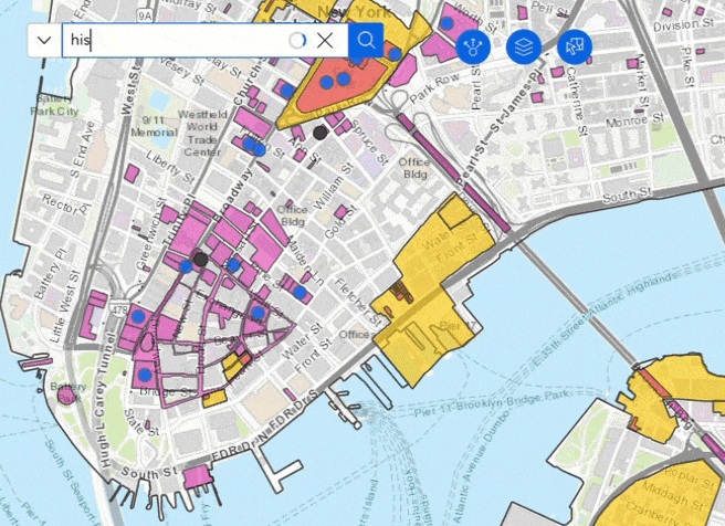 Además del widget de mapa, puede activar un parámetro de URL para el widget de búsqueda. Si tiene configurada una fuente de capa o una fuente de ubicación, el parámetro URL del widget de búsqueda le permite definir una entrada de búsqueda y definir qué fuente de búsqueda usar. En el siguiente ejemplo, busqué un distrito histórico y lo acerqué. Luego copié el enlace corto del widget Compartir. Cuando pega el enlace corto en una nueva pestaña del navegador, la aplicación se abre con el mapa y los estados de búsqueda exactos de la pestaña anterior del navegador.