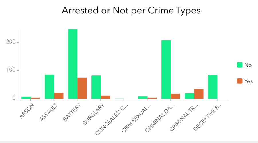 La nueva configuración Dividir por campo le permite dividir un campo de categoría por otro campo con valores únicos, para que pueda mostrar fácilmente comparaciones una al lado de la otra. En el siguiente ejemplo, el campo dividido de Arrestado tiene dos valores: sí o no.