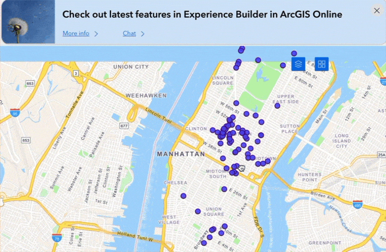 El widget Cerca de mí agrega aun más funciones. Puede mostrar símbolos de mapa en el panel de widgets, usar todas las funciones de una capa como área de búsqueda de entrada, y usar datos agregados en tiempo de ejecución desde el widget Agregar datos para análisis.
