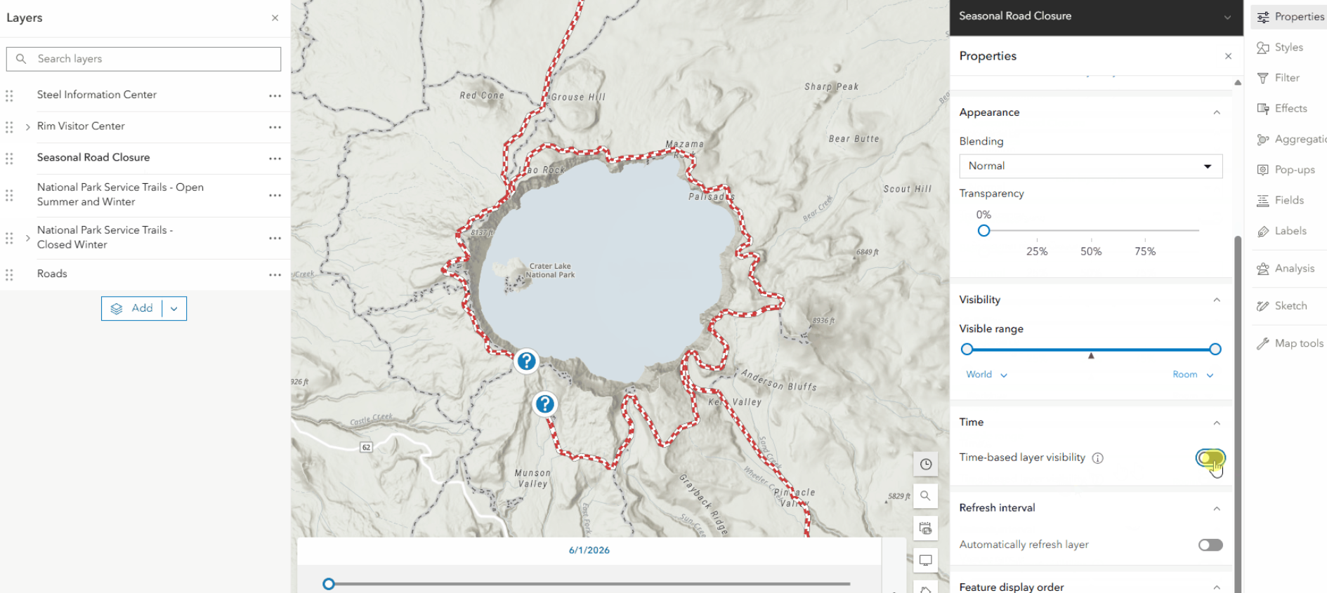 - Ahora puede habilitar la visibilidad de la capa basada en el tiempo para mostrar una capa solo durante un período de tiempo específico.