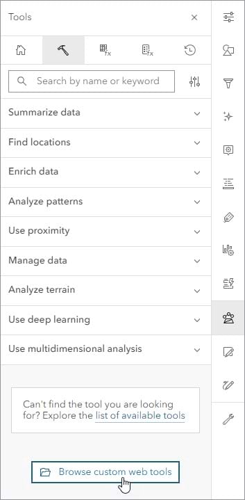 Las herramientas web personalizadas ahora están disponibles en Map Viewer. Las herramientas web publicadas desde Notebooks en ArcGIS Online se pueden ejecutar directamente en Map Viewer. Además, las herramientas web personalizadas publicadas en ArcGIS Enterprise se pueden agregar a ArcGIS Online como elementos de servicio de geoprocesamiento. También se puede acceder a estos elementos desde el panel de análisis de Map Viewer. Las herramientas web personalizadas funcionan como cualquier otra herramienta de análisis dentro de la interfaz de Map Viewer, lo que permite que una audiencia más amplia aproveche las capacidades analíticas avanzadas.