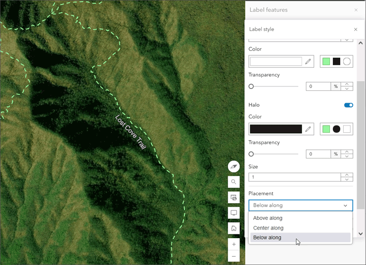 Al personalizar las etiquetas, ahora puede ajustar la posición de las etiquetas a lo largo de líneas como arroyos, caminos o senderos, como se muestra en la imagen a continuación.