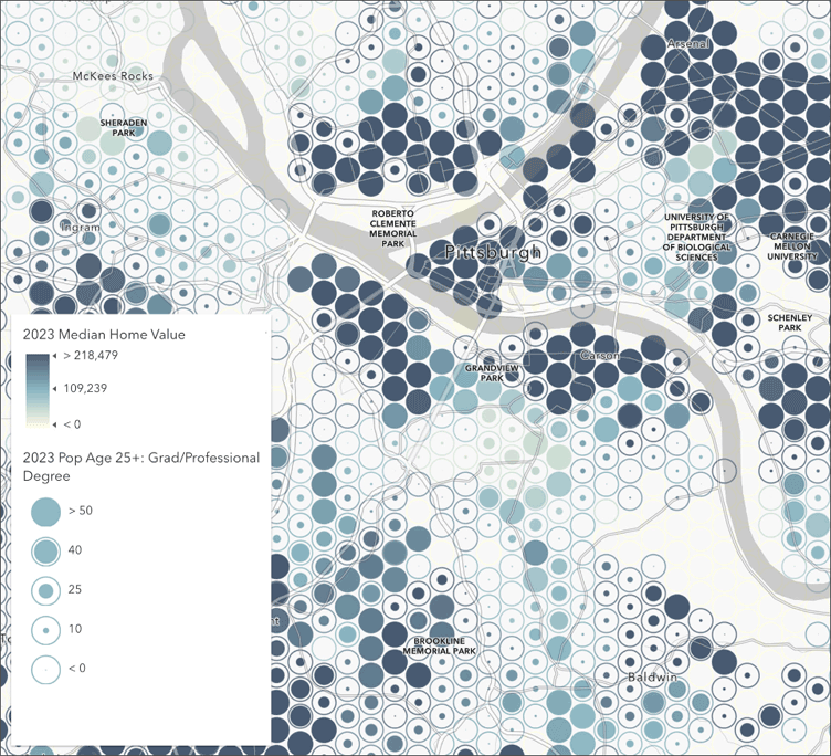 El nuevo tema Tamaño de referencia le permite visualizar valores en relación entre ellos, utilizando un contorno delimitador como referencia al diseñar una capa con recuentos y cantidades. Usted define la forma del tamaño de referencia (círculos, cuadrados, rombos, hexágonos (puntiagudos) o hexágonos (planos)), así como el rango de tamaño para la forma interna (variable) y la forma externa (fija en el máximo absoluto de datos). También define el umbral de lo que se considera alto y bajo dentro del rango de datos para mostrar valores en relación entre sí sin que los símbolos se superpongan.