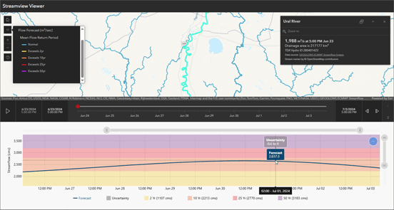 Los espectadores de la aplicación pueden interactuar con un gráfico que muestra el flujo del período de retorno para un segmento de flujo específico y animar los cambios en los datos de pronóstico para cada segmento de flujo utilizando el control deslizante de tiempo.