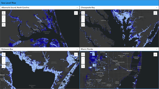 Compare se presenta en versión beta como una plantilla de aplicación de acceso anticipado. Compare permite a los usuarios comparar varios mapas (hasta cuatro) en la misma ubicación o ver varias ubicaciones del mismo mapa en un diseño de lado a lado, apilado o en cuadrantes. Elija hasta cuatro mapas, escenas o una combinación de ambos para visualizarlos al mismo tiempo. La navegación por mapas se puede sincronizar en todas las vistas mientras se usa la aplicación.