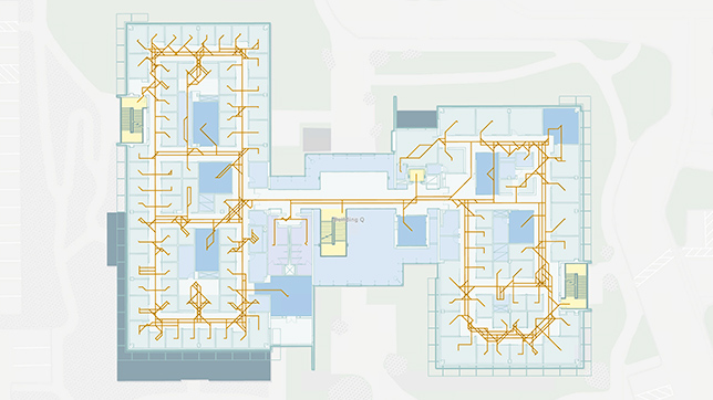 Los mapas de espacios cerrados construidos con ArcGIS Pro no sólo tienen en cuenta el piso, sino que también admiten la navegación a través de los espacios interiores. ArcGIS Indoors Pro incluye herramientas para generar automáticamente redes enrutables a partir de planos de planta que dan soporte a la navegación en el espacio interior en tiempo real.