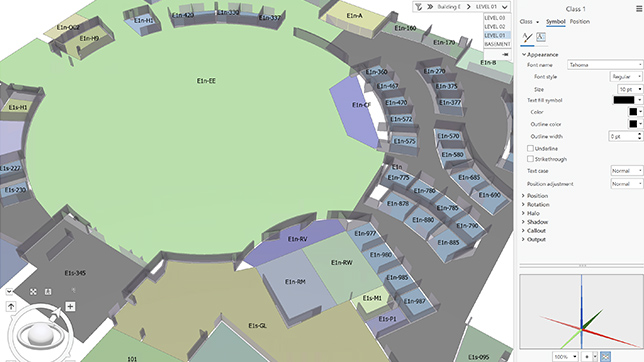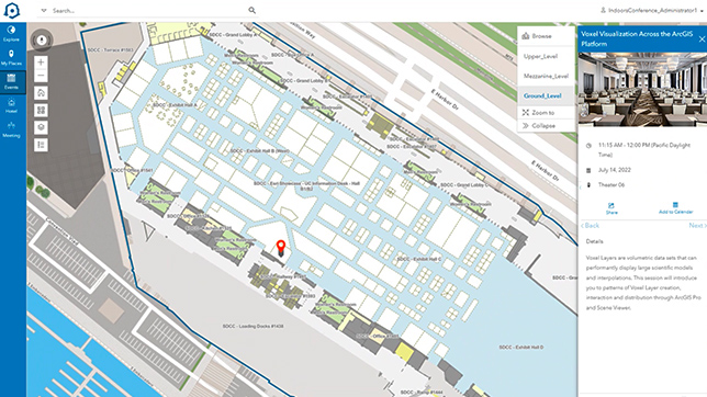 ArcGIS Indoors Pro permite convertir todos los datos de espacios interiores que has subido en datos del sistema de información geográfica (GIS), y utilizarlos para crear mapas de espacios interiores que tengan en cuenta el suelo. Estos mapas pueden utilizarse para apoyar la cartografía de activos, la seguridad y la programación de eventos.