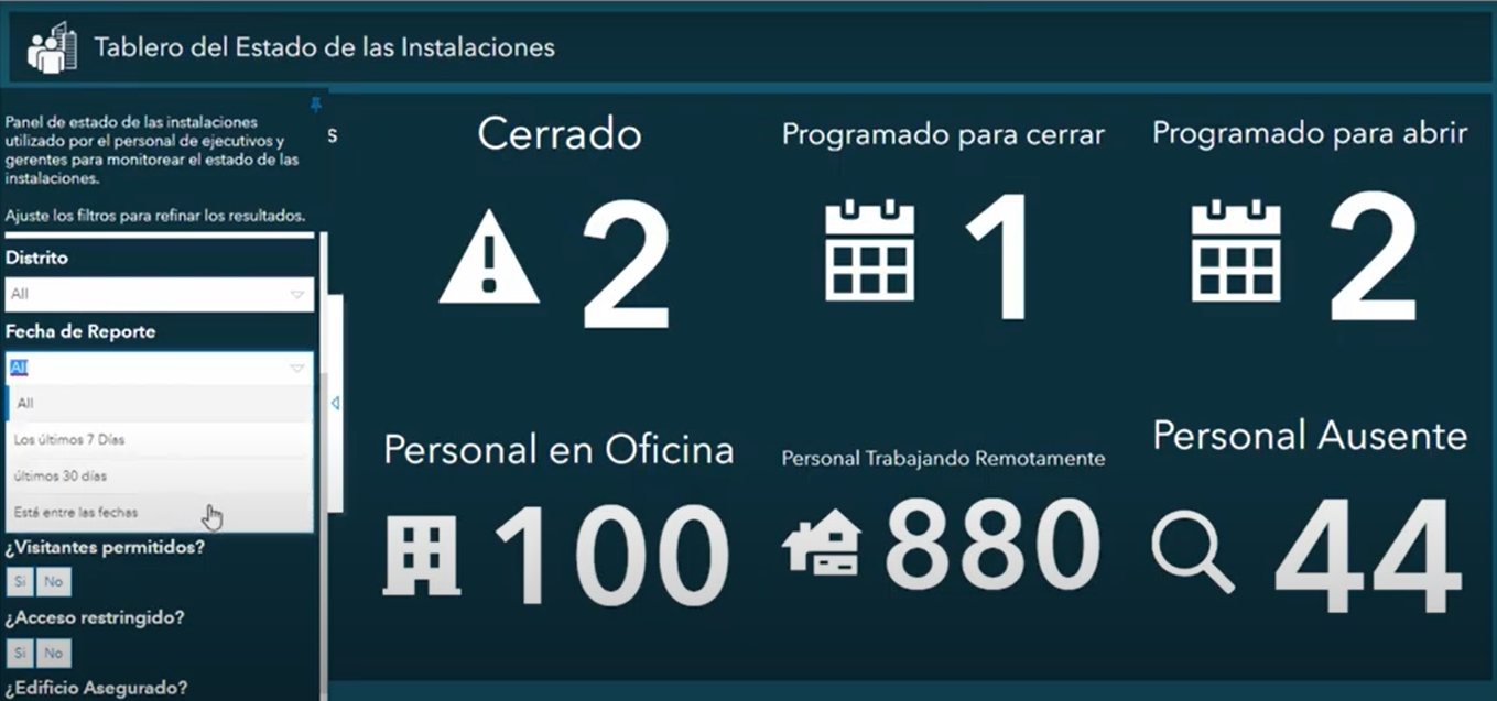 Conoce en este video demo las diversas maneras en que el componente de Monitoreo de Instalaciones ayuda, mediante tecnología geoespacial de ArcGIS, a recopilar información, monitorear y comprender activamente el estado de sus locales, tiendas y otros lugares, para así saber cuáles de sus instalaciones funcionan normalmente y cuáles están afectadas o cerradas, así como compartir el estado de ellas con otros tomadores de decisiones, entre muchas otras aplicaciones.